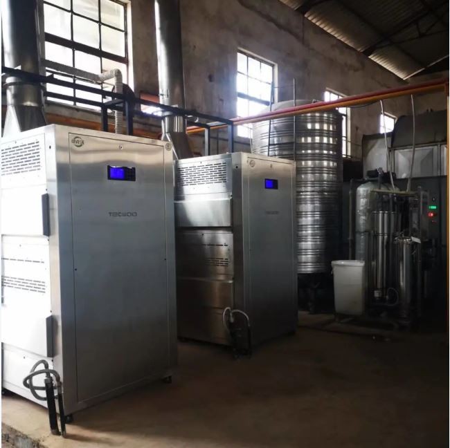1.水變清了。燃煤鍋爐和烘干爐使用時排出的廢水含有煤渣、硫磺等物質又黑又臭,需要經過沉淀脫硫處理才能用于綠化。使用天然氣以后蒸汽熱源機采用純水機制備純水供給蒸汽熱源機使用,廢水為純水機工作產生的濃縮水,不需要任何處理直接可以用于綠化。原來收集鍋爐和烘干爐廢水的收集池由黑水池、臭水池變成了長滿青苔和水草的綠色水池。